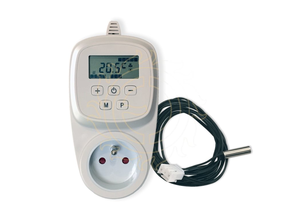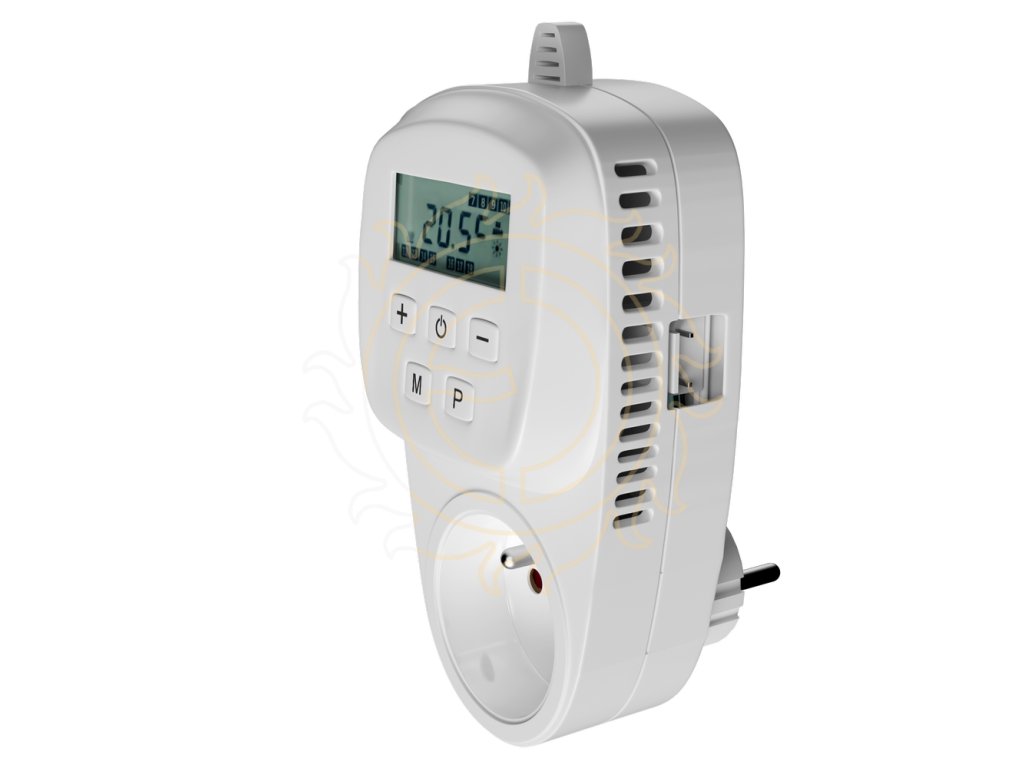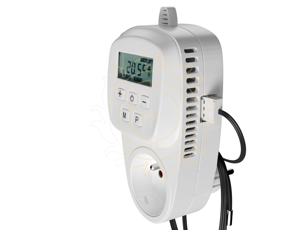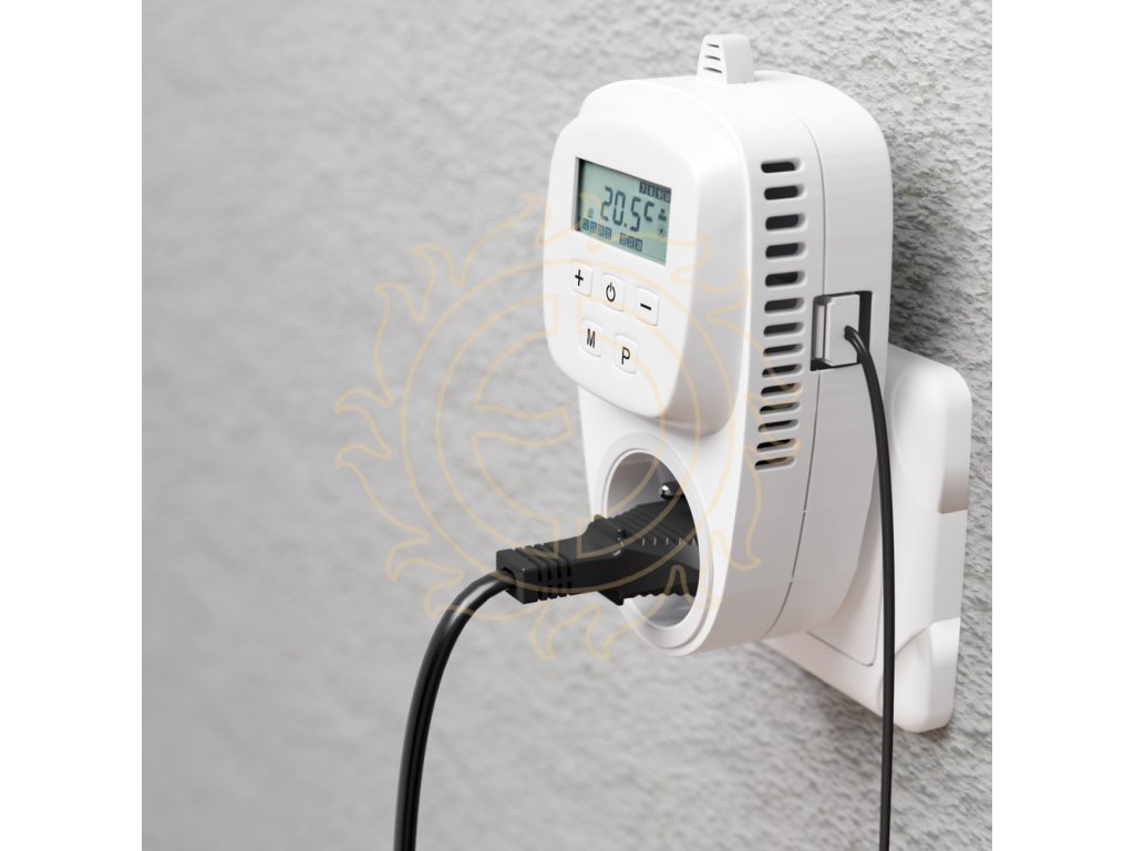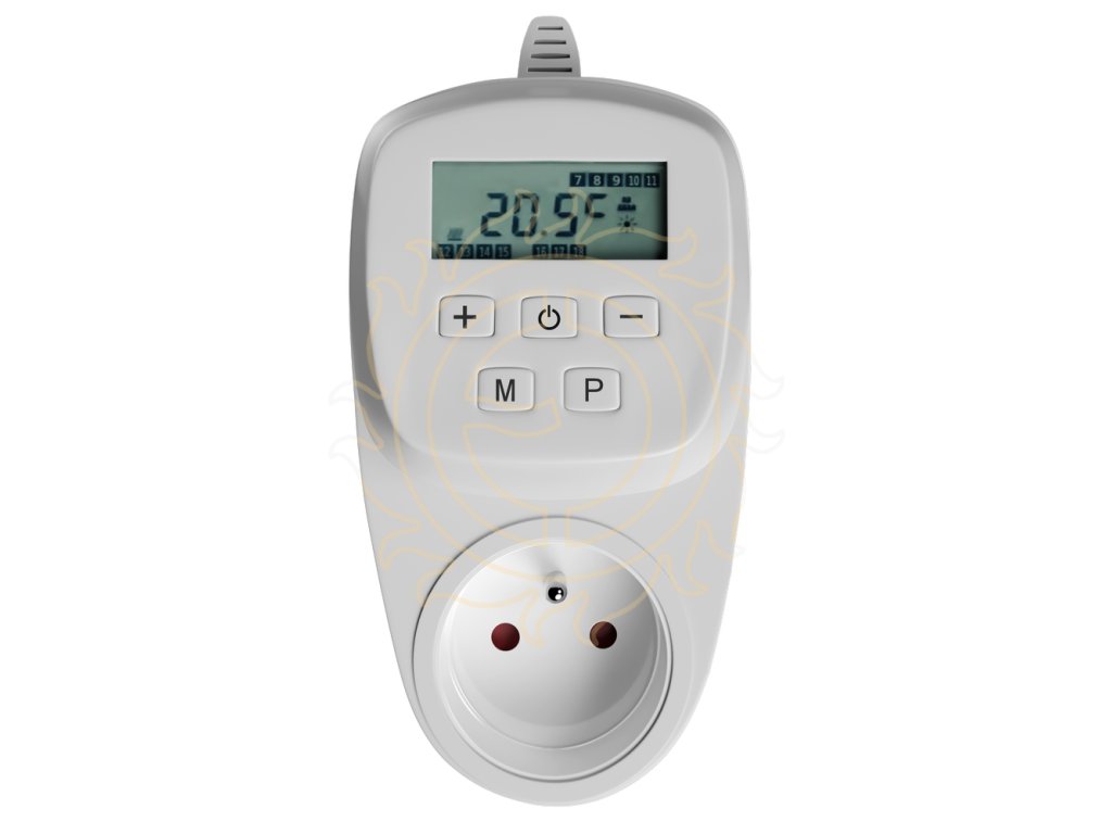 Zásuvkový programovatelný termostat s denním programem (možnost pro každý den v týdnu jiný), který přepíná mezi dvěma teplotami (Komfort/Útlum). Změna teploty je možná každou celou hodinu, tedy až 23x denně). Teplota je snímána interním čidlem (teplota vzduchu), nebo kabelovou sondou (čidlo délky 2 m / IP 66 je součástí balení). Nelze ale využívat obě sondy současně - v takovém případě termostat používá jen kabelové čidlo.Zásuvkový termostat je určen ke spínání sálavých topných panelů, topných žebříků, topných folií nebo panelů ULTRATHERM pro chovatele, ventilátorů apod.